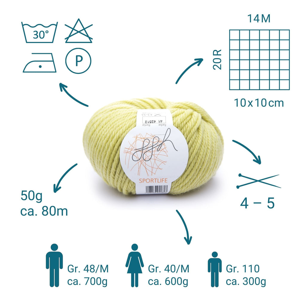 Die "ggh Sportlife" Wolle ist nicht nur weich und angenehm zu tragen, sondern auch pflegeleicht. Sie kann bei niedrigen Temperaturen im Wollprogramm der Waschmaschine gewaschen werden, was sie zu einer praktischen Wahl für alltägliche Kleidungsstücke macht. Dank ihrer Strapazierfähigkeit behält die Wolle auch nach häufigem Waschen ihre Form und Farbe.
